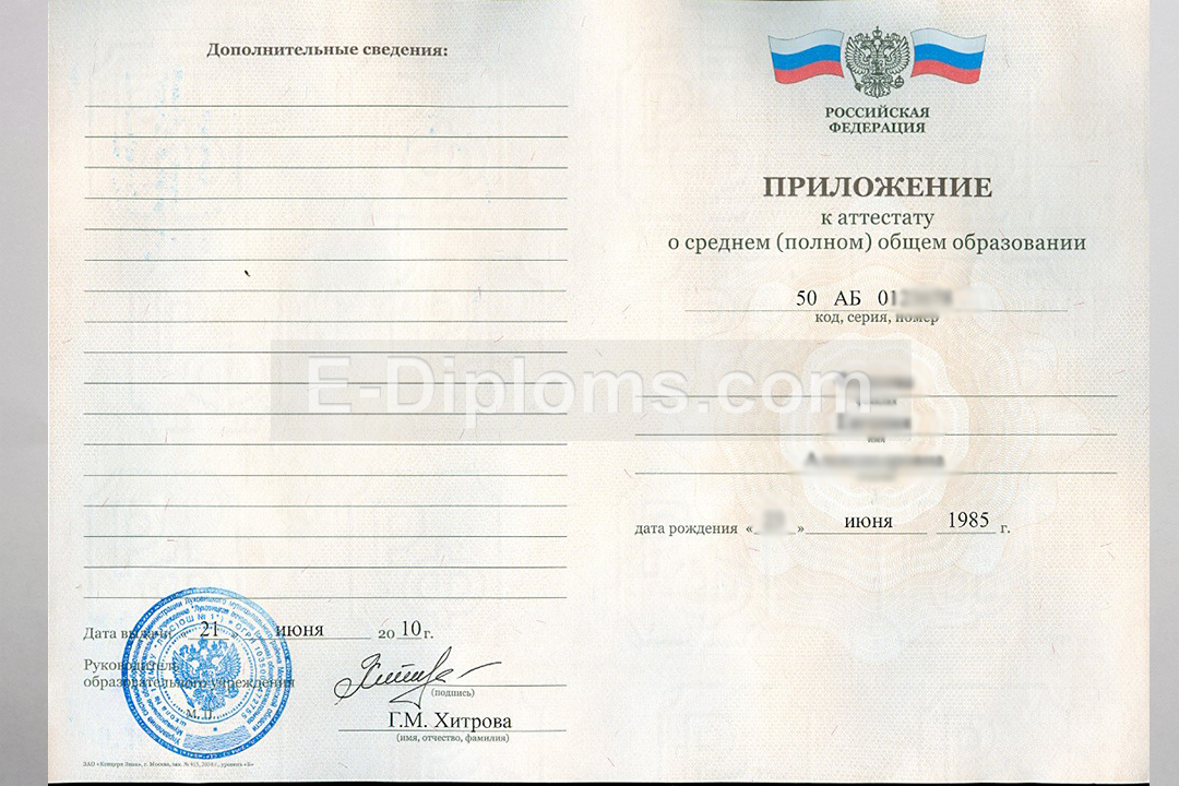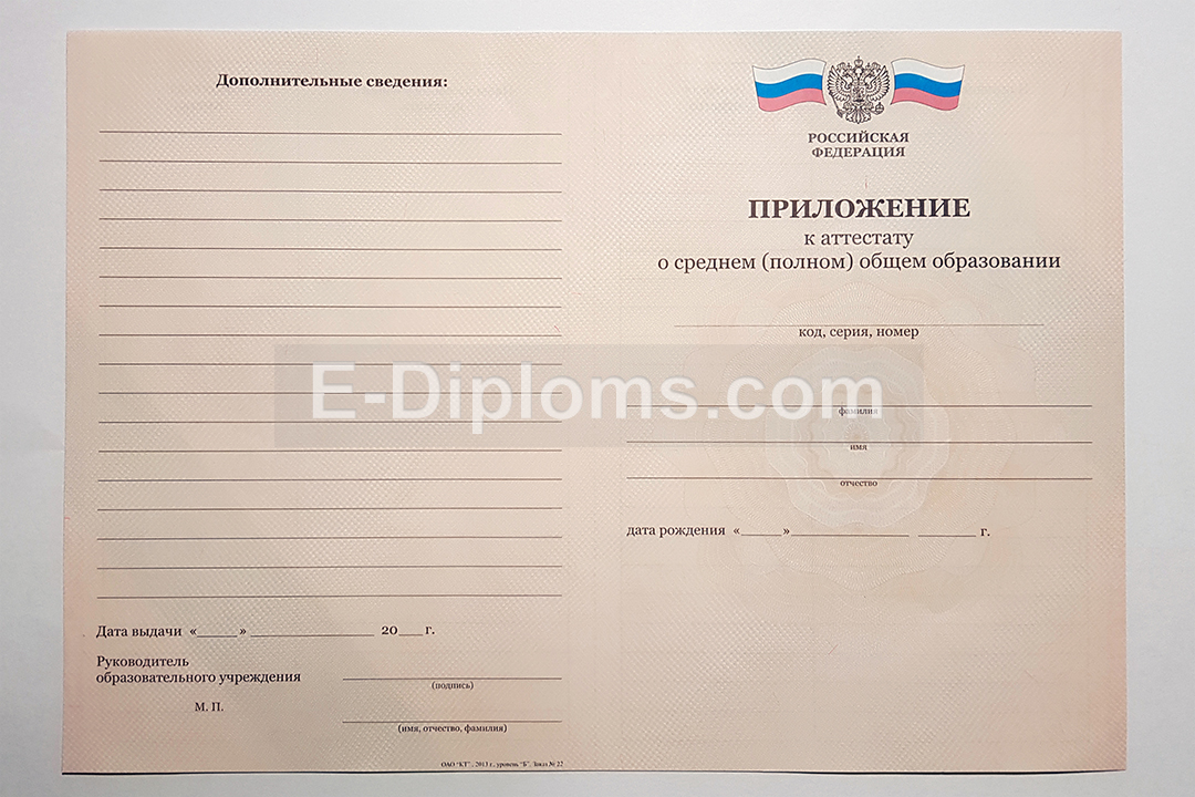 У нас на сайте Вы можете заказать аттестат об окончании 11 классов с 2010 по 2013 года включительно. Выбирайте любую школу России, а мы изготовим качественный документ быстро, профессионально, анонимно. Доставка бесплатна, оплата при получении, для проживающих в регионах доступна услуга «макет», есть скидки. При заказе до 14.00 привезем уже завтра!